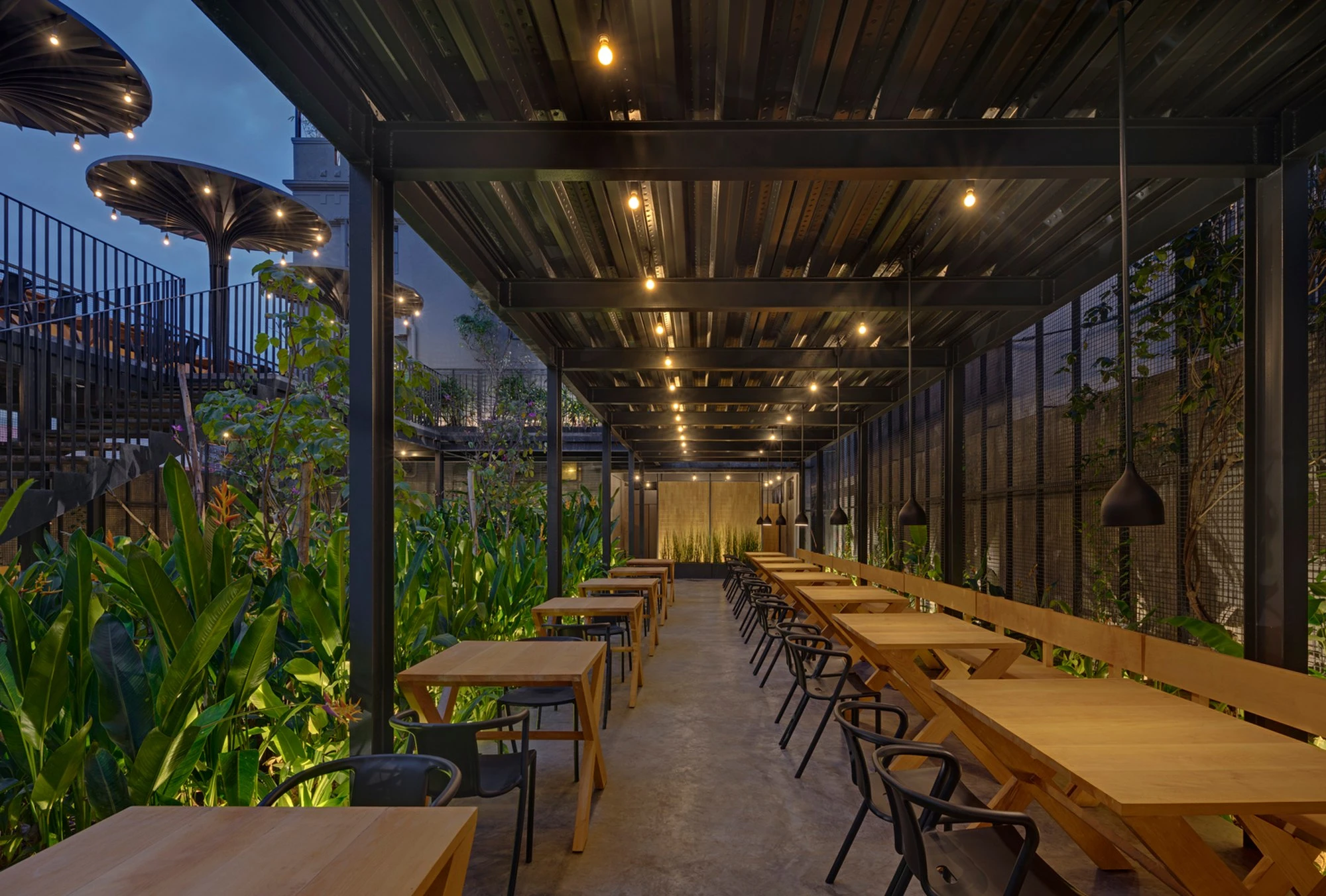 Genießen Sie Ihr Essen unter freiem Himmel mit weitem Stadtblick und stilvollen Überdachungen. Ideal für entspannte Mittagsgerichte oder romantische Abendessen im Freien.